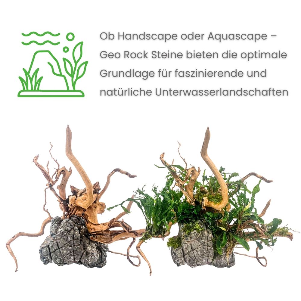 Da die Geo Rock Steine die Wasserwerte nicht beeinflussen, sind sie besonders pflanzenfreundlich. Sie bieten Aufsitzerpflanzen wie Anubias, Bucephalandra oder Javafarn eine ideale Grundlage zur Befestigung und tragen so zu einem lebendigen und nachhaltigen Aquascape bei.
