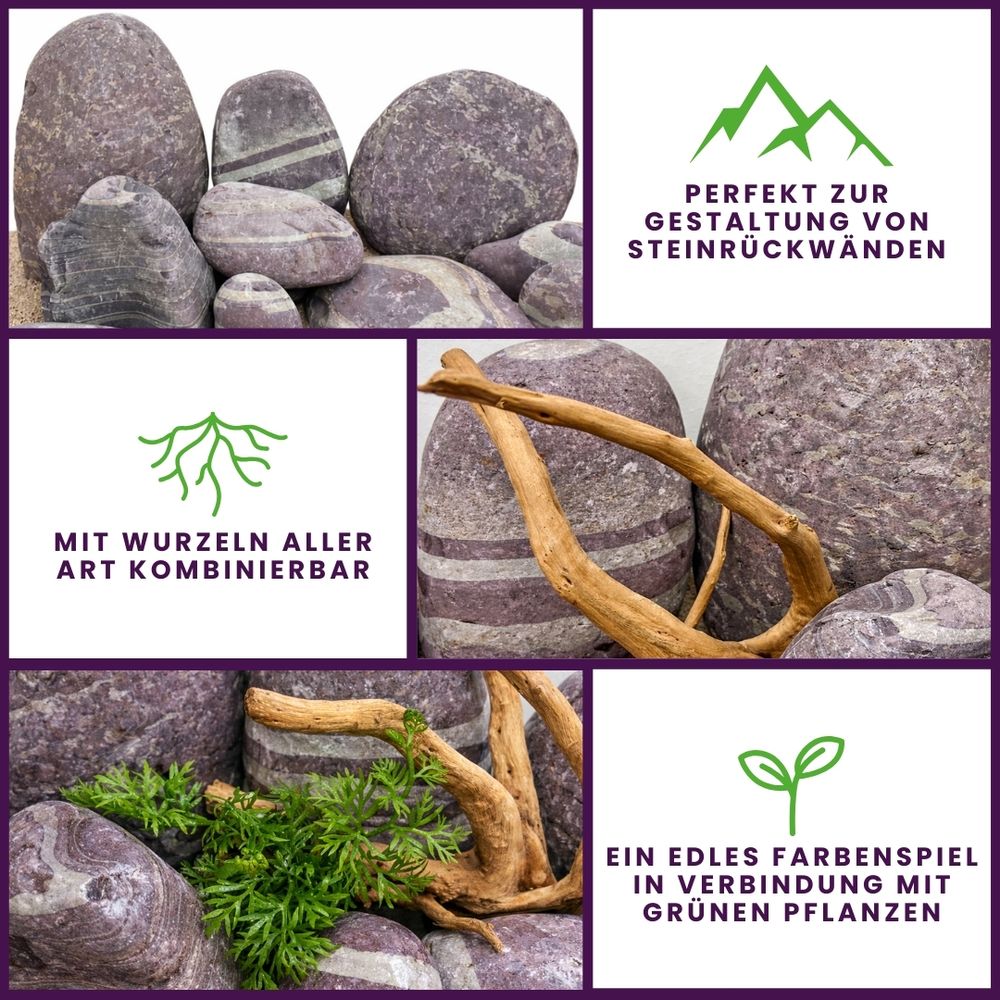 Durch ihre sanfte, naturbelassene Oberfläche lassen sich Purple Cloud Steine sehr gut zu ausgewogenen Steinsetzungen kombinieren.