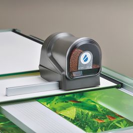 Der Futterautomat FishGuard versorgt die Fische im Aquarium rund um die Uhr. Bis zu vier Fütterungen mit je drei Dosierungen täglich können über ein LCD-Display vorprogrammiert werden.